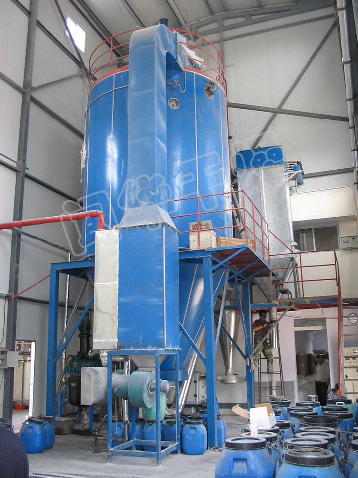 離心噴霧干燥工作原理:空氣經(jīng)過濾和加熱,進入干燥器頂部空氣分配器,熱空氣呈螺旋狀均勻地進入干燥室。料液經(jīng)塔體頂部的高速離心霧化器,(旋轉(zhuǎn))噴霧成細微的霧狀液珠,與熱空氣并流接觸在短時間內(nèi)可干燥為成品。成品連續(xù)地由干燥塔底部和旋風(fēng)分離器中輸出,廢氣由風(fēng)機排空。